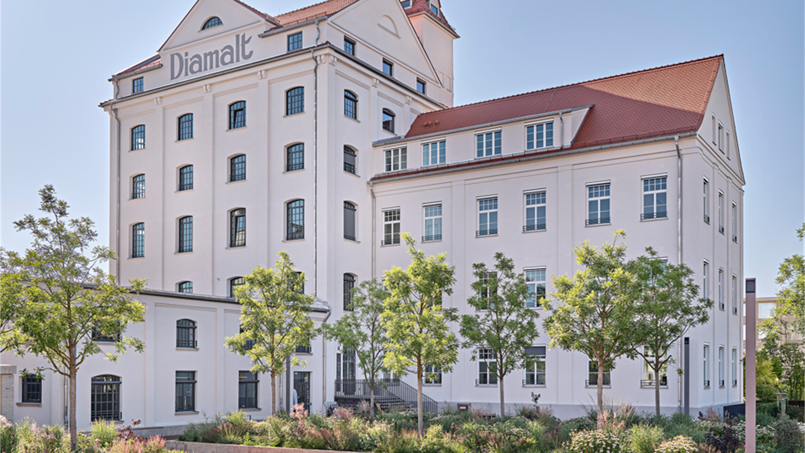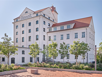 Denkmalgeschütztes, revitalisiertes, historisches und zentrales Gebäude der ehemaligen Suppenwürze und Werkstatt auf dem Gelände der früheren Diamaltwerke in Allach. Hier trifft Historie auf Moderne. Wo früher Malzbonbons und Suppenwürze produziert wurden, sind heute moderne Loft Offices im Industrie-Look neben neugebauten Mitarbeiterwohnungen und einer Kindertagesstätte entstanden. Baujahr 2019-2024; Denkmalschutz, Industrie, Office, Coworking
