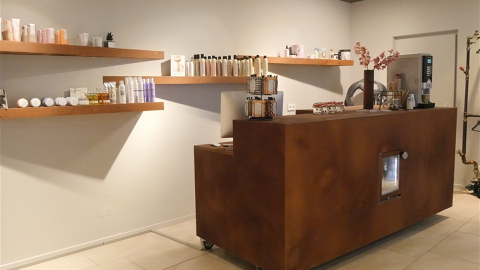 Friseursalon mit einzigartiger Einrichtung im Industrial-Style in ruhiger Hinterhoflage im Münchner Stadtteil Schwabing. In der Mitte des Ladens steht ein multifunktionaler runder Tisch mit einzeln aufklappbaren Spiegeln. Ein Großteil der Einrichtung besteht aus beweglichen Elementen. Die Rezeption steht auf Rollen und könnte als Tresen genutzt werden für Barmotiv.